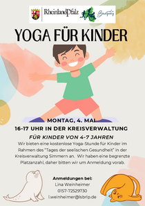 Für Kinder von 4-7 Jahren. Wir bieten eine kostenlose Yoga-Stunde für Kinder im Rahmen des “Tages der seelischen Gesundheit” in Simmern an. Wir haben eine begrenzte Platzanzahl, daher bitten wir um Anmeldung vorab.