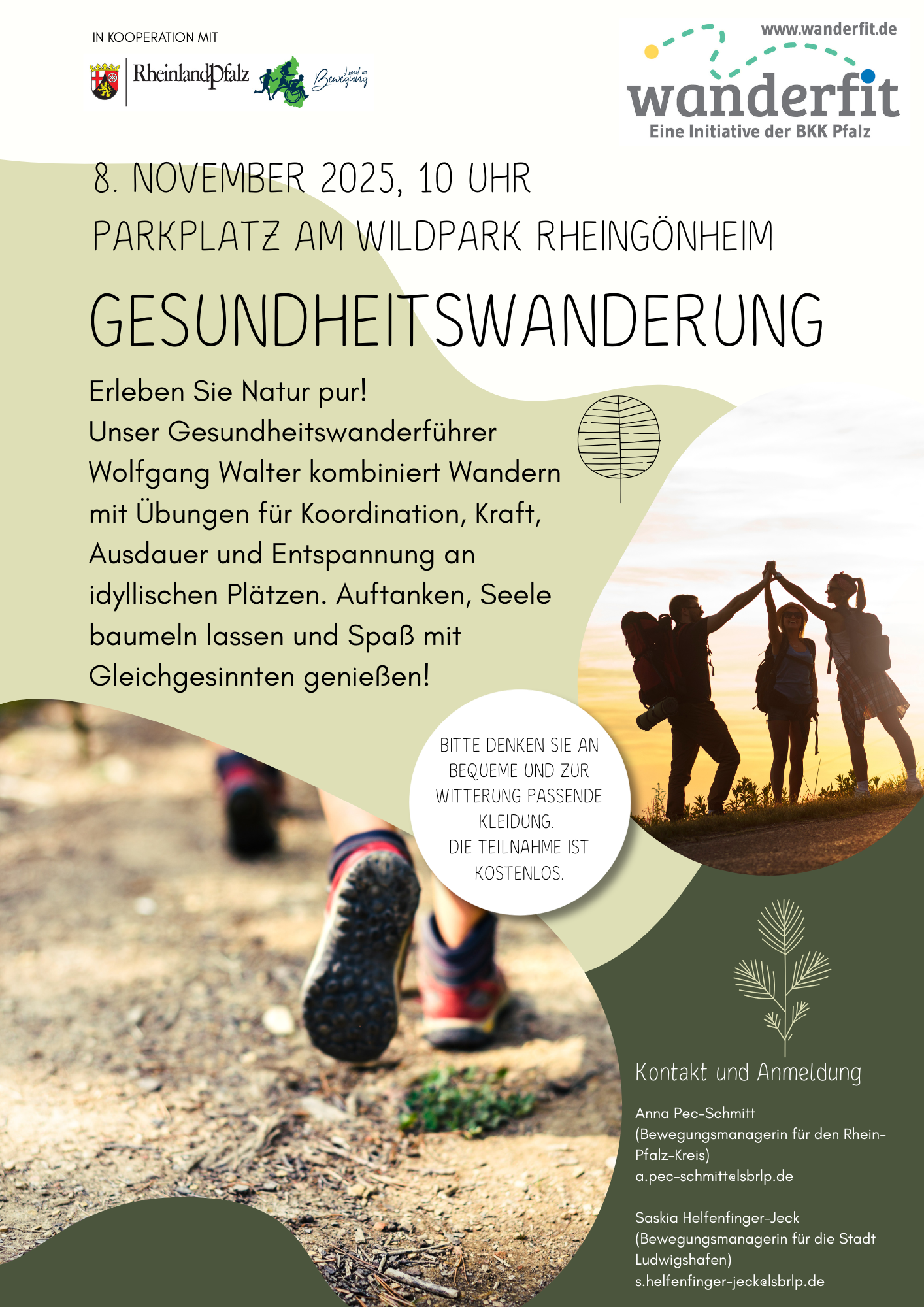 Am 8. November 2025 um 10 Uhr lädt die Initiative wanderfit der BKK Pfalz in Kooperation mit der Landesinitiative „Rheinland-Pfalz – Land in Bewegung“ zu einer besonderen Gesundheitswanderung ein. Treffpunkt ist der Parkplatz am Wildpark Rheingönheim.