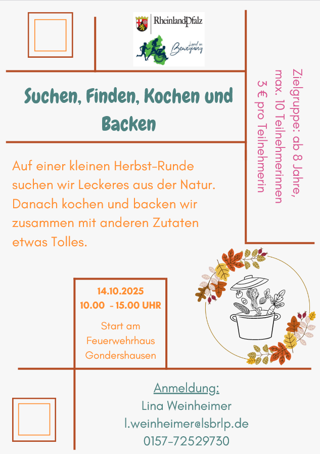 Auf einer kleinen Herbst-Runde suchen wir Leckeres aus der Natur. Danach kochen und backen wir zusammen mit anderen Zutaten etwas Tolles.