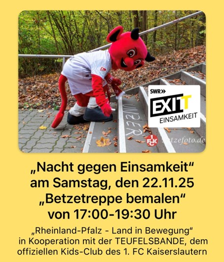Auch in Kaiserslautern ist etwas geboten: Die Landesinitiative „Rheinland-Pfalz - Land in Bewegung“ in Kooperation mit der TEUFELSBANDE, dem offiziellen Kids-Club des 1. FC Kaiserslautern, laden ganz herzlich zum „Betzetreppe bemalen“ ein.